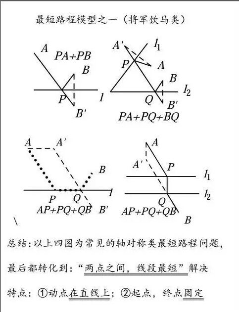 最短路線問題通常是以“平面內連結兩點的線中,線段最短”為原則引申出來的。人們在生產、生活實踐中,常常遇到帶有某種限制條件的最近路線即最短路線問題.下面簡單談一下初中數學中遇到的最短路線問題。對于數學中的最短路線問題可以分為兩大類:第一類為在同一平面內;第二類為空間幾何體中的最短路線問題,對于平面內的最短路線問題可先畫出方案圖,然后確定最短距離及路徑圖。