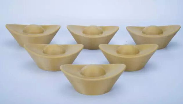 在我國歷史上,最能令人熟記的莫過于金元寶了。金元寶由貴重的黃金或白銀制成,一般白銀居多,黃金稀見。在唐初開元通寶行世時,民間就有取其碩大、貴重之意,旋讀為“開元通寶”的。而元代呼金銀錢為“元寶”,則是元朝之寶的意思。這些3D打印的金元寶,采用了經典款的金色PLA材料打印,打印出來的金元寶透露出啞光,使得其外形效果逼真。一大波“金元寶”襲來,頓時感覺自己富有了!