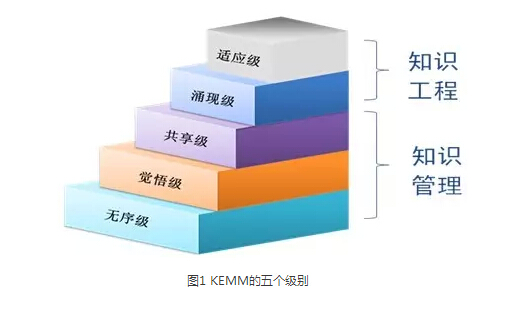 知識工程建設(shè)是一個系統(tǒng)工程,不僅僅是一套軟件的交付,它是人、技術(shù)和流程協(xié)同發(fā)展的過程,是一個從低級向高級發(fā)展的過程。知識工程實施的成熟度模型(Knowledge Engineering Maturity Model,簡稱KEMM),用來衡量一個組織綜合運用知識、實現(xiàn)目標(biāo)的能力。KEMM模型定義了五個級別,分別為1-無序級、2-覺悟級、3-共享級、4-涌現(xiàn)級和5-適應(yīng)級。