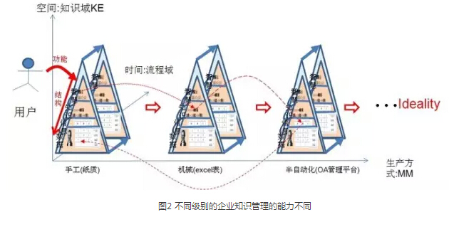 如圖2 所示,以簡單的任務(wù)計劃管理為例,口頭管理也是一種管理方式,但對于管理者的依賴性就很大,認(rèn)真負(fù)責(zé)、年富力強的管理者自然效果更好,記性不好的管理者就總會顧此失彼,完全不可控、不可重復(fù)、不可復(fù)制,顯然這不是長久之計。于是需求推動發(fā)展,管理者進(jìn)入了:“好記性不如爛筆頭”階段,管理的效果就會好一些,減少了波動;之后使用計算機和軟件工具輔助管理,能夠進(jìn)一步提高效率、減少失誤。推進(jìn)“無紙辦公”引入了辦公自動化系統(tǒng),不僅僅是節(jié)約了不可再生的紙質(zhì)資源,也能夠利用計算機的快速運算、大容量存儲和網(wǎng)絡(luò)通訊等技術(shù),也有利于固化流程,推廣最佳實踐,將單個事務(wù)處理流程的效率提高到最大限度,并減少人力消耗。